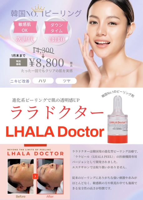 ララドクター 2026.01.19 ララドクター(LHANA Doctor) 【1月末まで】 通常14,300円 → 8,800円(税込) ✔ 敏感肌OK ✔ ダウンタイムほぼ0 ✔ 1回でも透明感UP 医療機関専用ピーリング剤を使用。 刺激が少なく、赤みが出にくいのが特徴です。 「ピーリングは不安…」という方にこそ 試してほしい施術です✨ #ララドクター #韓国ピーリング #敏感肌OK #透明感アップ #吉祥寺皮膚科